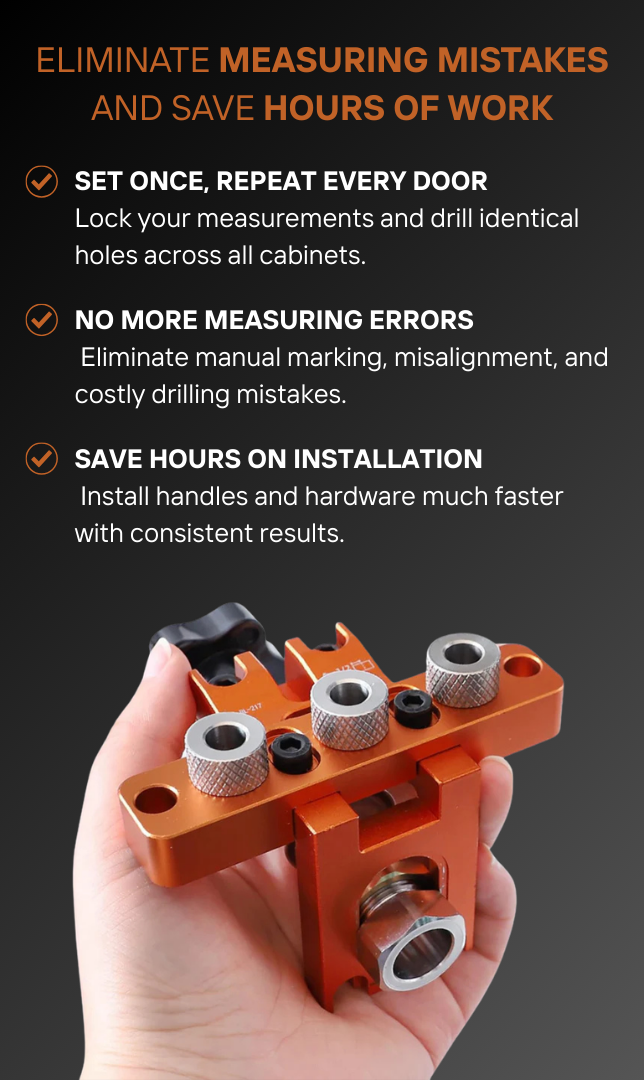 With laser-engraved measurement scales and hardened drill guides, you get millimeter-level accuracy and perfectly aligned hardware across every cabinet door and drawer.